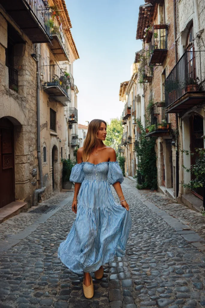 This outfit is the definition of effortless summer boho. The woman is wearing a light blue and white striped off-shoulder maxi dress with puffed sleeves and a flowy silhouette that moves gracefully with every step. The lightweight cotton fabric gives it that carefree, vacation-ready vibe, while her woven slip-on shoes add a cozy, grounded touch. The cobblestone street and sunlight make the whole look feel perfectly relaxed and wanderlust-inspired.
