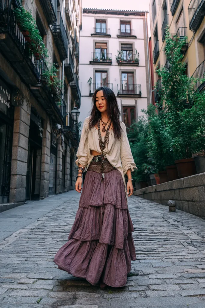 This outfit is pure bohemian artistry. The woman is wearing a flowy tiered maxi skirt in a muted mauve tone, paired with a loose ivory blouse that’s effortlessly tucked in. The layered necklaces and wide belt add depth and texture, making every detail feel intentional. The natural fabrics and earthy colors give it that relaxed, lived-in charm that’s so signature to boho fashion.