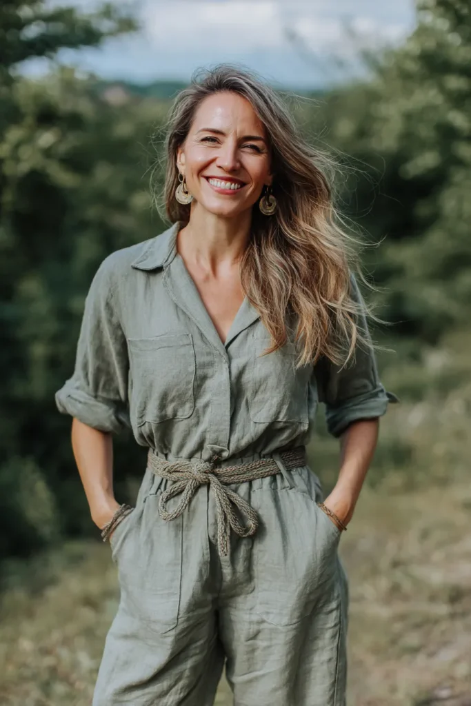 This outfit is the perfect mix of comfort and sophistication. The woman is wearing an olive green linen jumpsuit with rolled sleeves and a relaxed fit that feels airy and effortless. The waist is tied with a braided rope belt that adds texture and definition, while her gold statement earrings give the look a touch of earthy elegance. The soft, natural tones blend beautifully with the outdoor setting, creating that easygoing boho mood that never feels forced.
