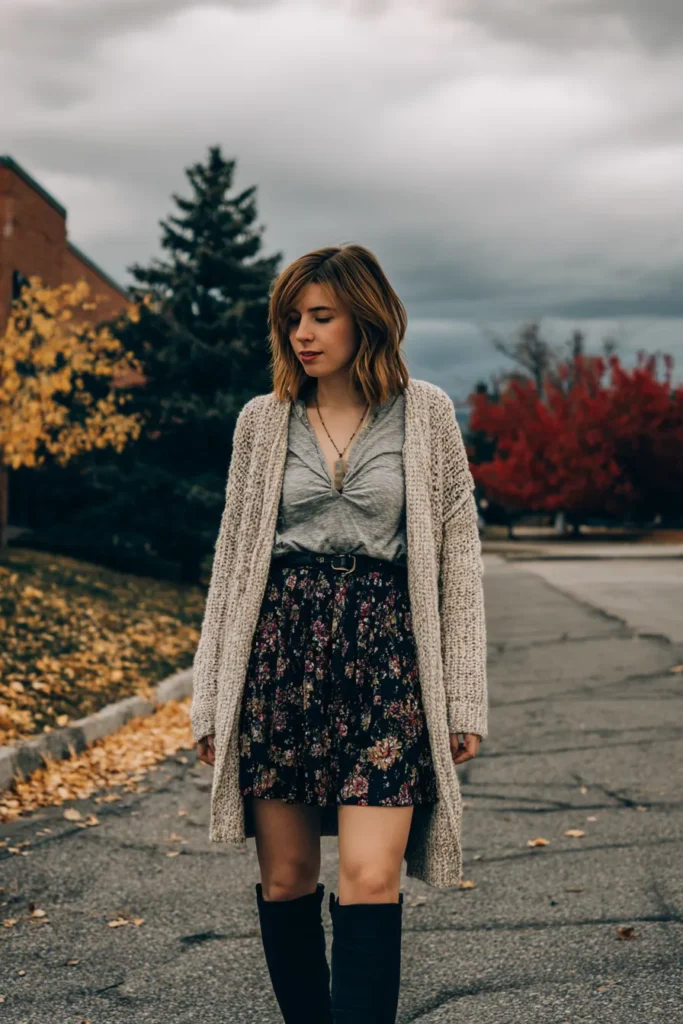 This outfit feels like a warm hug on a crisp fall day. The woman is wearing a soft beige knit cardigan layered over a knotted gray tee and a high-waisted floral mini skirt. The textures balance each other perfectly, and the muted tones let the floral pattern pop without being loud. Her tall black boots add a sleek touch, grounding the look while keeping it playful and cozy.