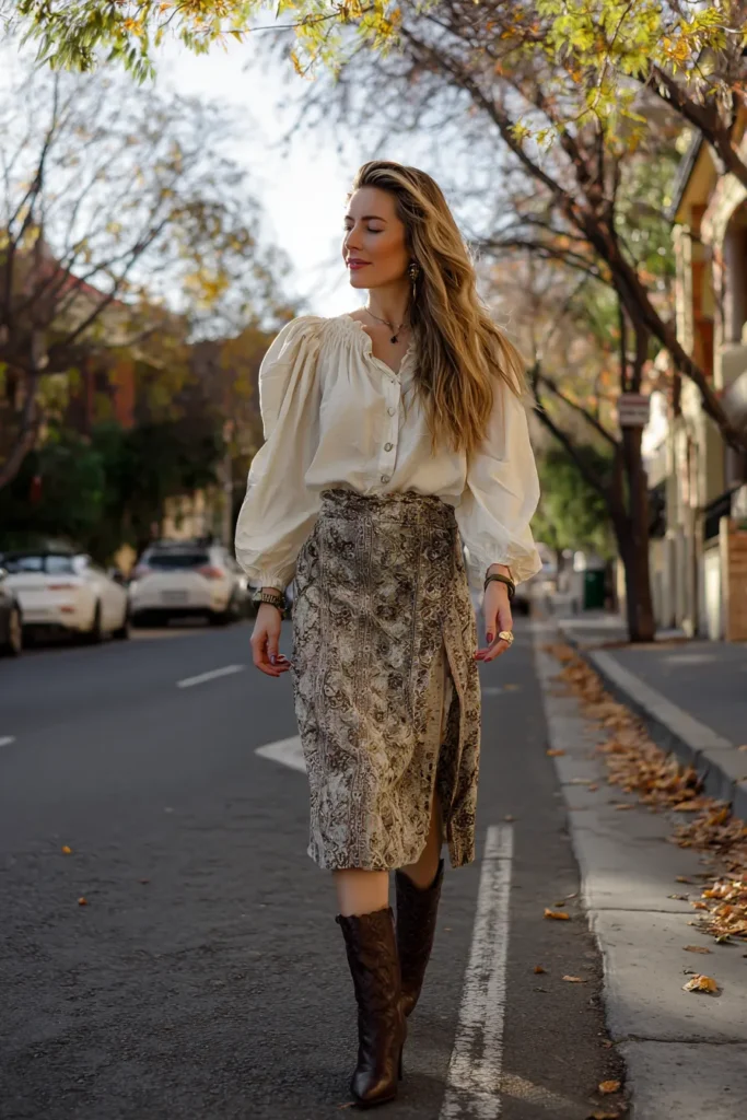 This outfit gives off that elegant, free-spirited vibe that makes boho style feel timeless. The woman is wearing a soft cream blouse with voluminous sleeves tucked into a patterned midi skirt with earthy tones. The fabric moves beautifully and has that slightly crinkled texture that feels natural and unpolished in the best way. Her dark brown cowboy boots add just enough edge to balance out the softness of the look.