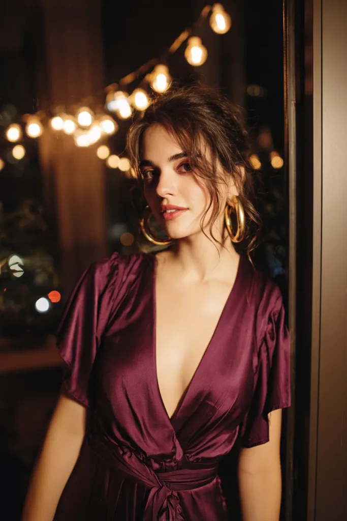 This outfit is pure elegance with a touch of free-spirited flair. The woman is wearing a deep plum wrap dress made of soft satin that drapes beautifully and catches the light in the most flattering way. The deep V-neckline adds a hint of allure while still feeling classy, and the tied waist perfectly defines her shape. She finishes the look with large gold hoop earrings that shimmer under warm lights, adding that perfect boho-meets-glam touch.