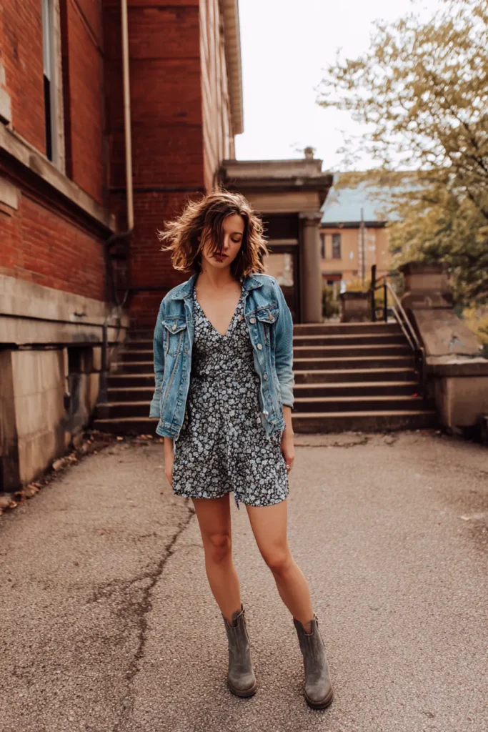 This outfit captures that perfect mix of sweet and laid-back. The woman is wearing a flowy floral mini dress in muted tones, paired with a classic blue denim jacket and gray ankle boots. The lightweight dress adds a soft, feminine touch, while the jacket and boots bring in just enough edge to make it look cool and casual. The whole vibe feels effortless, like she’s ready for an impromptu afternoon adventure.