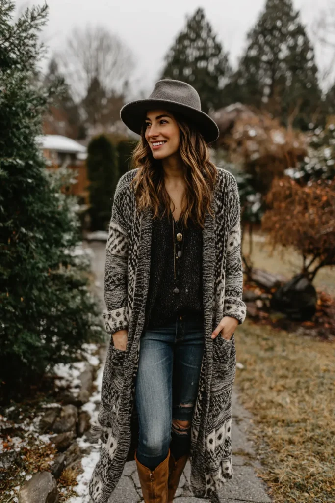 This outfit is the ultimate cozy boho dream. The woman is wearing a long patterned knit cardigan in shades of gray and cream, layered over a black textured top and fitted jeans with subtle distressing. Her brown boots add that rustic finish, while the wide-brim hat ties it all together with effortless charm. The mix of textures and earthy tones gives it that relaxed, outdoorsy vibe that feels perfectly put together without trying too hard.