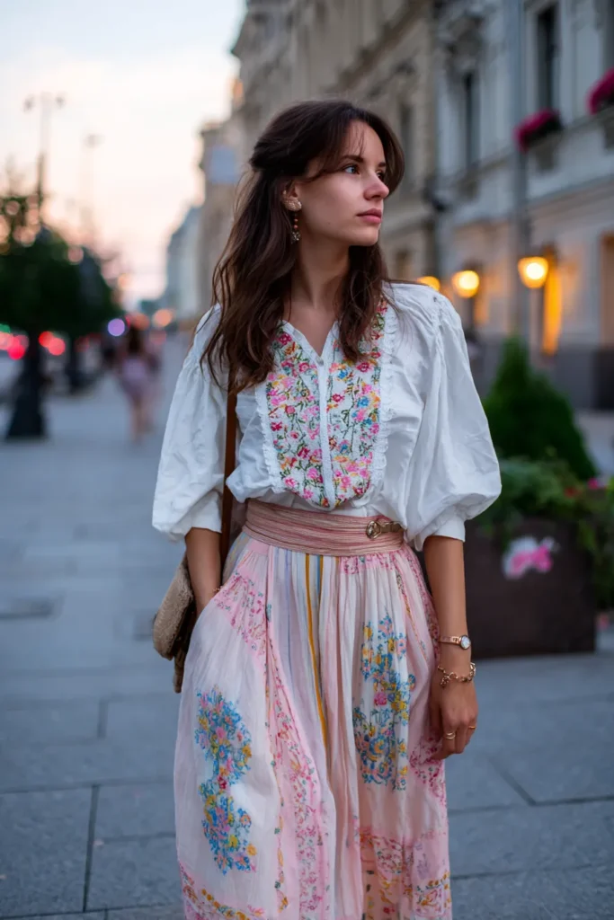 This outfit is the kind of romantic boho look that turns heads without even trying. The woman is wearing a white peasant-style blouse with puffed sleeves and colorful embroidery, paired with a long, flowy skirt in soft pink tones featuring delicate floral patterns. The fabric looks airy and lightweight, moving gracefully with every step. The woven bag and dainty jewelry add the perfect finishing touches, making the look both charming and timeless.