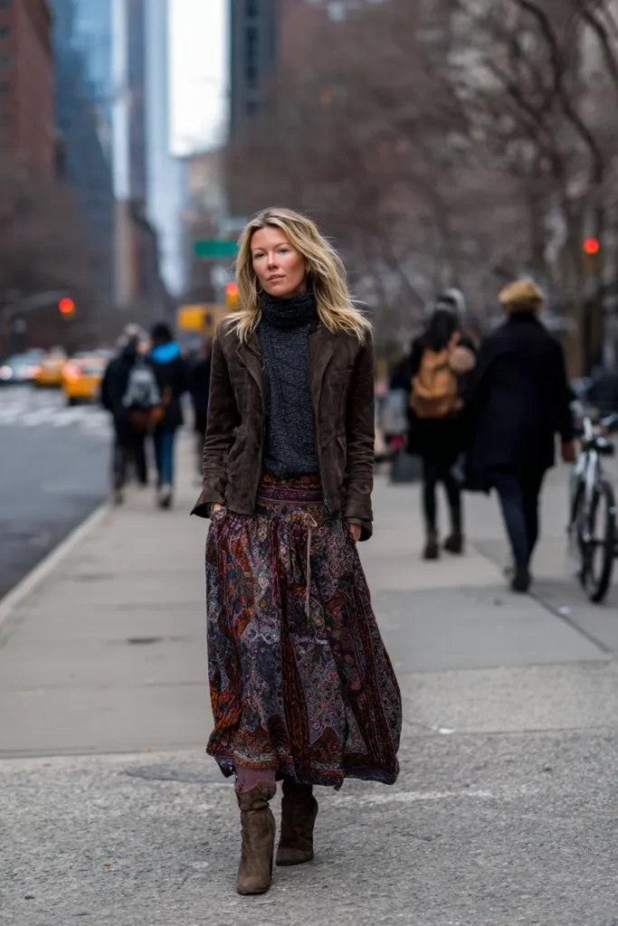 This outfit blends city chic with boho flair in the best possible way. The woman is wearing a flowy paisley maxi skirt with rich autumn hues, paired with a dark turtleneck and a fitted brown suede jacket. Her slouchy ankle boots complete the look, adding just the right amount of rugged charm. The combination of textures and earthy tones gives the outfit warmth and depth while keeping it perfectly wearable for city life.