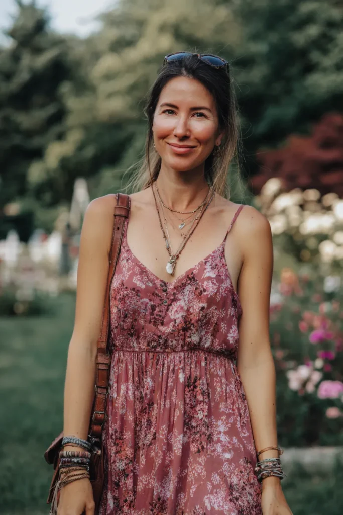This outfit captures the heart of boho summer style so beautifully. The woman is wearing a flowy floral maxi dress in shades of rose and plum, complete with delicate straps and a soft, airy fabric that drapes naturally. Her layered necklaces, bracelets, and brown leather crossbody bag add the perfect touch of earthy charm. The whole look feels easygoing, sun-kissed, and full of personality.