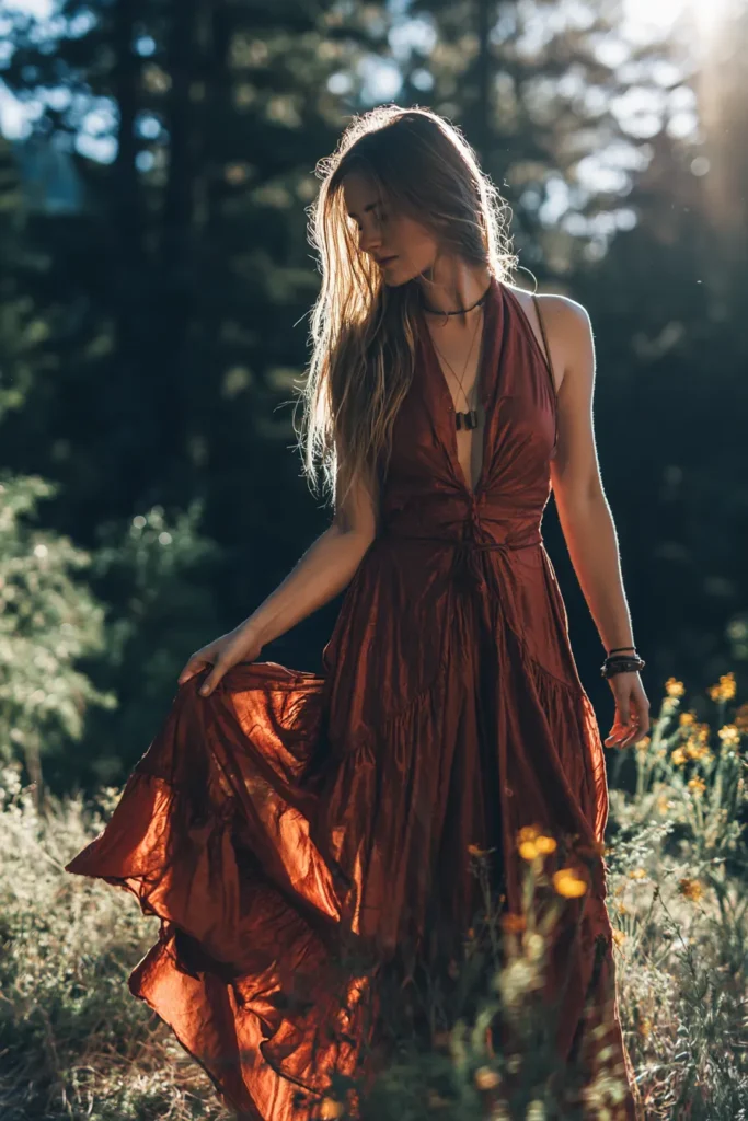 This look is pure magic. The woman is wearing a rust-colored halter maxi dress that catches the light beautifully with its soft, flowing fabric. The deep neckline and gathered waist create that flattering, feminine shape boho fashion is known for. Her minimal jewelry and loose waves add a natural charm, and the way the sunlight hits the dress makes it feel like something straight out of a golden-hour dream.