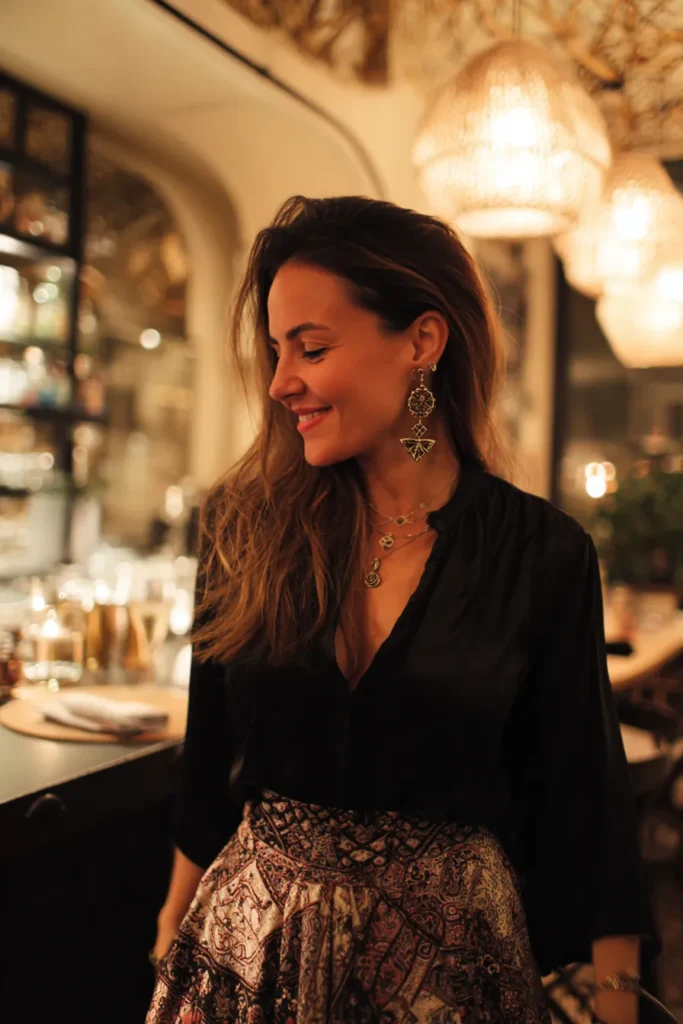 This outfit is the definition of relaxed glamour. The woman is wearing a silky black blouse tucked into a patterned boho skirt with intricate earthy tones and rich textures. Her statement earrings steal the spotlight, shimmering gold with geometric shapes that perfectly balance her layered necklaces. The dim, cozy lighting enhances the whole look, giving it that effortlessly warm and inviting vibe that fits perfectly for an evening dinner or a chic night out.
