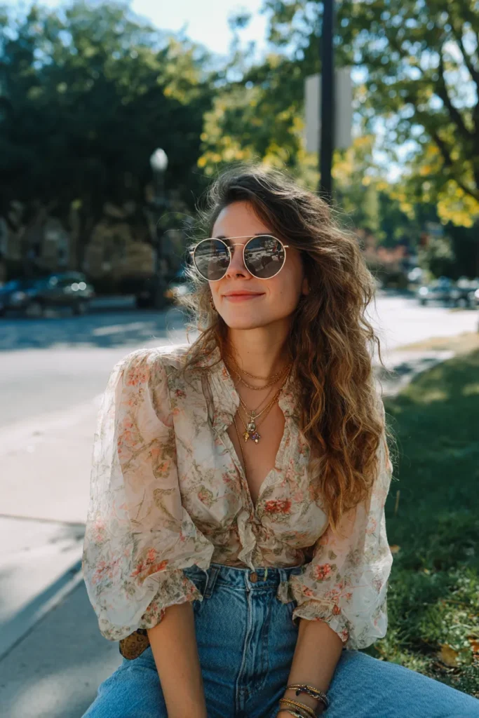 This look nails the balance between feminine and carefree. The woman is wearing a sheer floral blouse with delicate puff sleeves and soft pastel tones, tucked into a pair of high-waisted jeans that keep it casual and grounded. Her layered gold necklaces, round sunglasses, and loose wavy hair complete the effortlessly chic vibe. It feels romantic without being fussy, and totally wearable for a sunny day out.