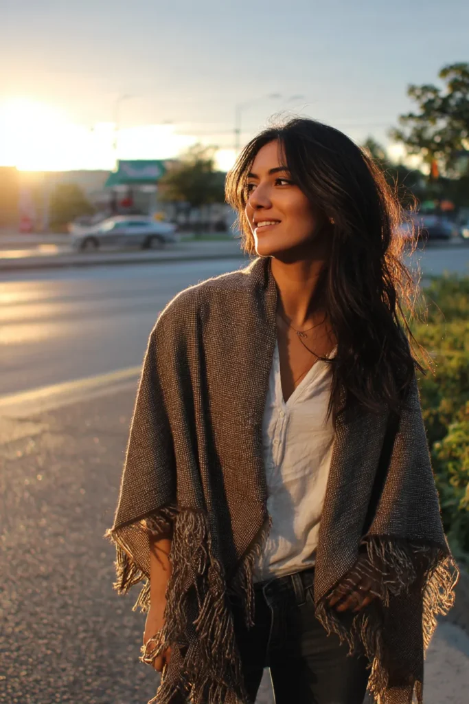 This outfit captures that perfect mix of simplicity and charm. She’s wearing a loose white blouse paired with dark denim jeans, wrapped in a soft woven shawl that has tasseled edges. The earthy brown tone of the shawl blends beautifully with the golden sunset light, giving the look an effortlessly warm, bohemian feel. Her hair is tousled just right, and the minimal jewelry keeps everything looking natural and relaxed.