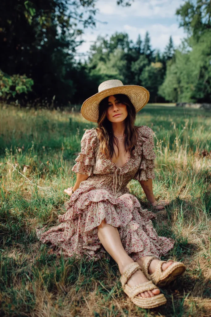 This outfit looks like it was made for slow summer days in the countryside. The woman is wearing a soft floral maxi dress with ruffled sleeves and a tiered skirt that flows beautifully with every breeze. The print is delicate and vintage-inspired, with tiny red flowers scattered across a warm beige background. She completes the look with a wide straw hat and woven platform sandals, giving it that effortless bohemian charm that feels both timeless and relaxed.