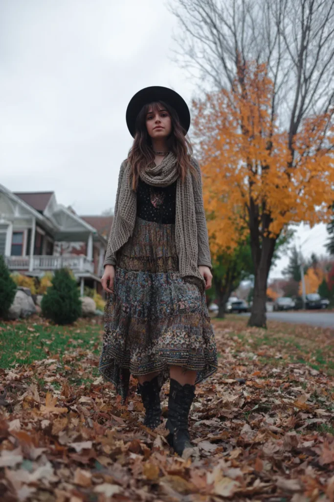 This outfit captures everything I love about boho style in autumn. She’s wearing a flowy printed maxi skirt with intricate patterns in earthy tones, paired with a black embroidered top that adds just the right touch of detail. The chunky knit scarf draped loosely around her neck brings texture and warmth, and the black hat ties the whole look together. Her lace-up boots peek out from under the skirt, adding a hint of edge to the otherwise soft and whimsical vibe.