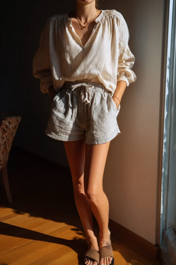 This outfit is the definition of relaxed elegance. She’s wearing a light, airy striped blouse with soft pleats and a slightly oversized fit that gives it a lived-in, carefree vibe. It’s tucked into a pair of drawstring linen shorts in a neutral tone that feels fresh and timeless. The look is finished with simple brown slides and delicate layered jewelry, creating that easy boho aesthetic that’s perfect for warm days spent lounging or exploring.