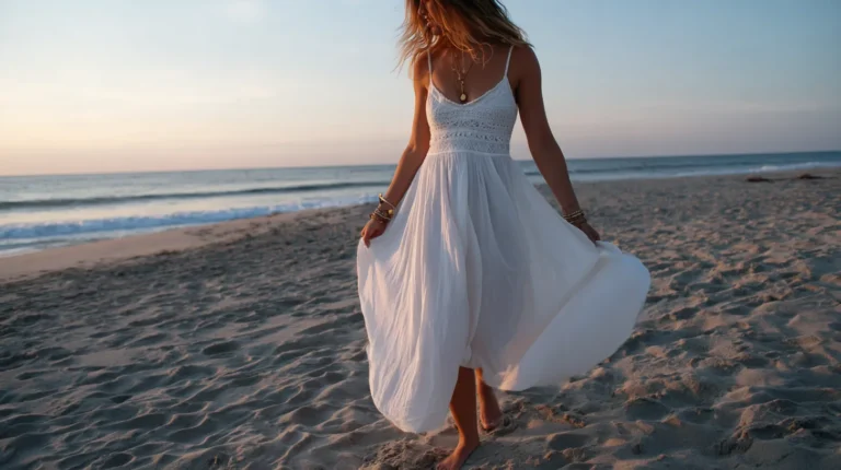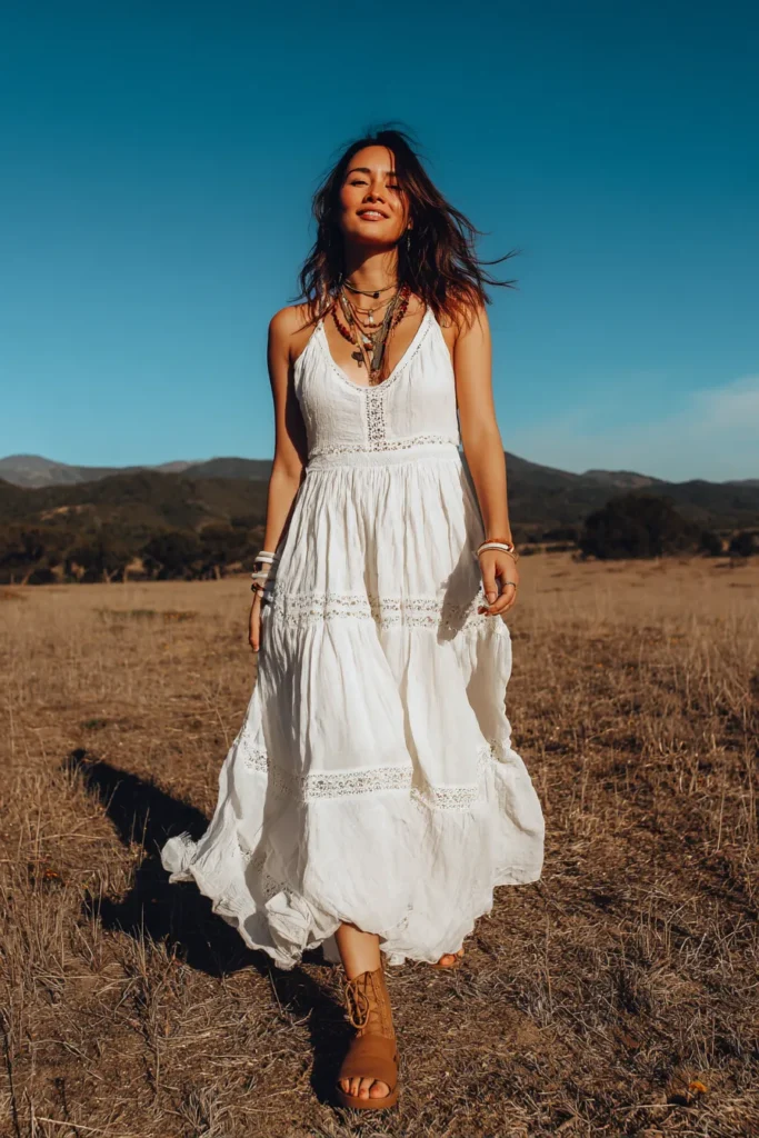 This outfit is pure bohemian magic. She’s wearing a white tiered maxi dress made from light, airy fabric that moves beautifully with every step. The lace trim adds a feminine touch, while the deep neckline and relaxed fit give it that free-spirited charm. Her layered necklaces and bangles bring warmth and personality, and the tan lace-up sandals complete the earthy, sun-soaked vibe. It’s one of those looks that feels effortless but instantly striking.
