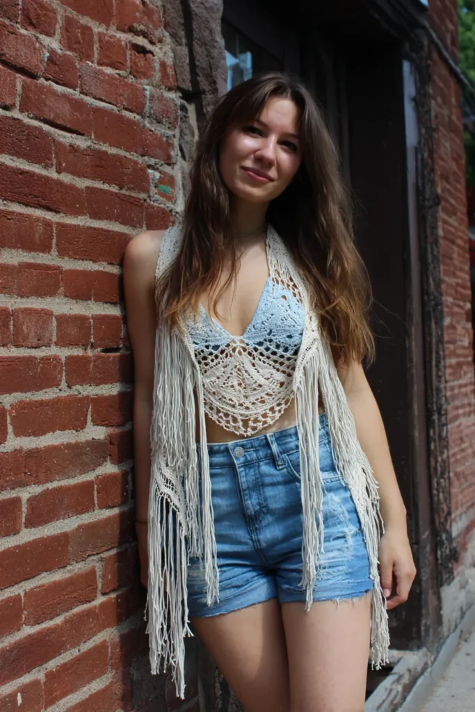 I am so in love with the texture play happening here, it’s just so good. The detailed crochet overlay on the simple bralette is such an easy way to add that handmade, artisan feel that boho lovers adore. Since the bottoms are simple denim shorts, the focus stays right up top on those amazing textures and the fringe detail, which moves so nicely when you walk. I think it looks incredibly flattering because the high waist of the shorts lengthens the look of the legs, and the fringe helps draw attention inward. It’s just the ultimate, cool girl way to beat the heat.