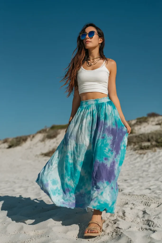 This is the ultimate carefree, sun-drenched bohemian look, absolutely screaming summer vacation vibes. The showstopper is a voluminous, flowy maxi skirt made from a lightweight, crinkled fabric featuring a bold tie-dye pattern in vibrant turquoise, bright blue, and rich purple hues. The skirt has a comfortable elasticated or smocked waistline. She keeps the top simple with a form-fitting white scoop-neck crop top that highlights her midriff. Layered gold necklaces and chic mirrored sunglasses complete the look, perfectly suited for a sunny day at the beach or a warm outdoor market.