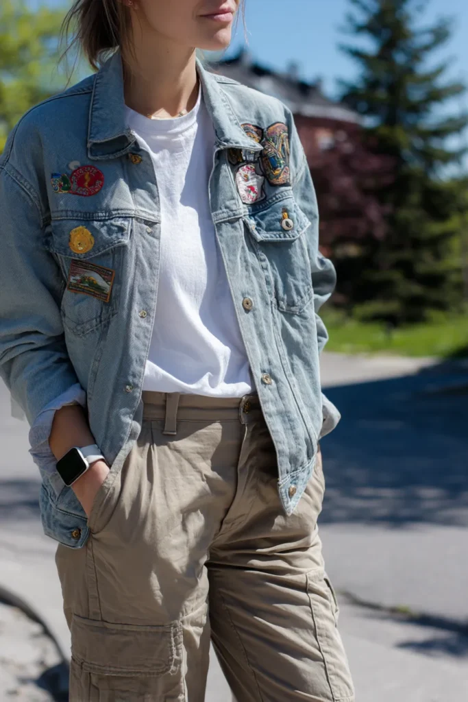 I totally love the spirit of this look because it’s all about making basics your own. That patch-covered denim jacket is the ultimate conversation starter and shows off so much personality. Pairing it with neutral, relaxed cargo pants keeps the overall silhouette comfortable and grounded, giving off that functional, ready-for-anything vibe. If you’re into expressing yourself through your clothing, personalizing a denim jacket like this is the easiest way to do it. It feels totally unbothered and effortlessly cool, which is always my style goal.
