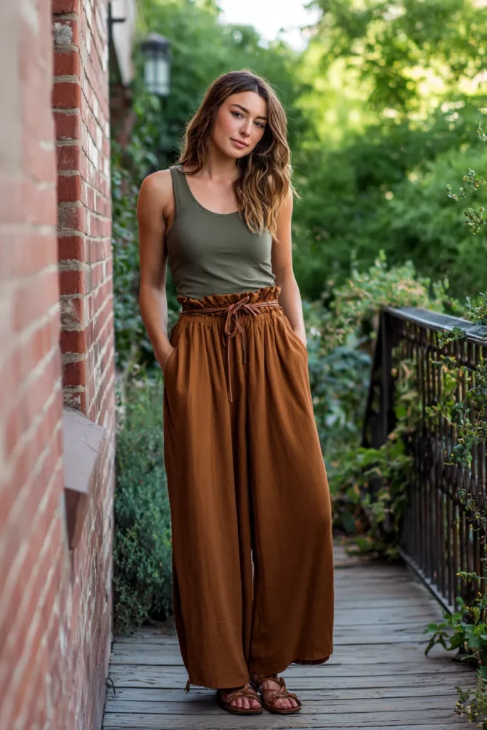 This look is all about embracing breathable fabrics and warm, grounded colors for a comfortable yet elevated summer style. The outfit features beautifully draped, wide-leg trousers in a rich, earthy tone like burnt sienna or deep caramel brown. They have a high, paper-bag style waist emphasized by a matching drawstring tie, creating wonderful volume and movement. This is paired simply with a fitted, scoop-neck tank top in a muted olive green or sage color. The whole look is tied together with simple brown leather strapped sandals that enhance the natural, relaxed aesthetic.