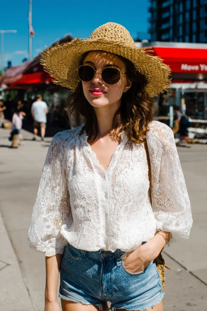 This is the quintessential high-summer bohemian look, radiating effortless sunshine vibes. The top half features a gorgeous white blouse crafted from intricate lace or eyelet fabric, giving it beautiful texture and breathability. It has long, slightly billowy sleeves that are pushed up and a soft, ruffled V-neckline that ties gently at the bust. This romantic top is perfectly contrasted with simple, light-wash, high-waisted denim cutoff shorts that are slightly distressed for an authentic feel. Finishing the look with a straw hat and round sunglasses screams vacation mode.