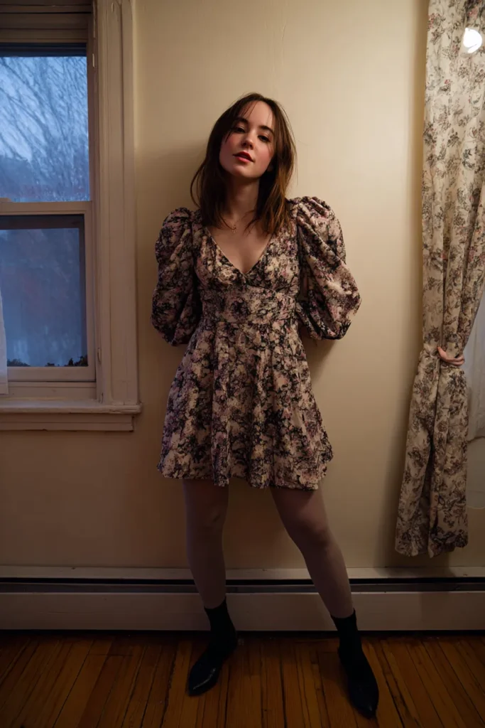 This dress brings that romantic, slightly Victorian-inspired boho feel perfect for dressing up on a chilly evening. It’s a short, flirty mini dress featuring a deep, plunging V-neckline created by a wrap or tie-front detail. The fabric has a moody, dark floral print, combining blacks, deep purples, and dusty pinks for a vintage look. The most defining feature is the voluminous puff sleeves that gather dramatically at the elbow or forearm, balancing the short hemline. She keeps her legs warm with light-colored tights and pairs the look with sharp, black pointed-toe ankle boots.