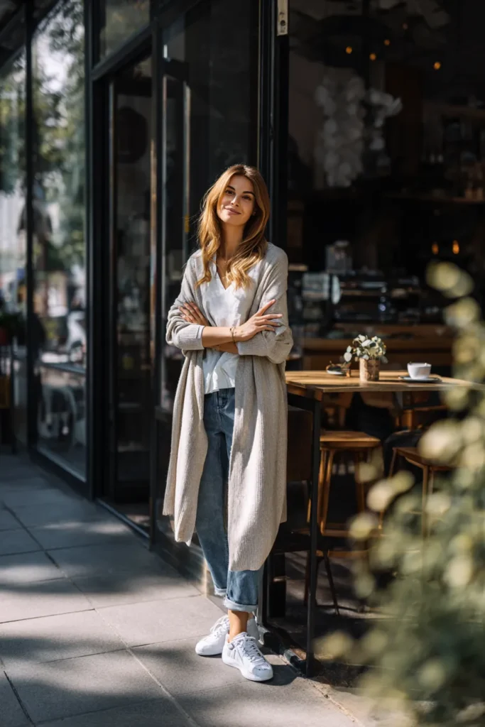 I find this outfit so appealing because it is the masterclass in mixing comfort with effortless style. The long, flowing cardigan adds that beautiful vertical line and a layer of soft texture that just screams cozy chic. Keeping the inside layers light and white makes the whole look feel fresh, even with the cozy knit. The cuffed jeans showing off the white sneakers is such a great styling trick that keeps the look from feeling too heavy or covered up. Honestly, this is my ideal outfit for a weekend coffee run or meeting friends for brunch when I want to look effortlessly put-together.