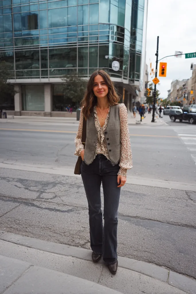 I think this outfit is incredibly sharp and feels much more elevated than just jeans and a top. The layering of the patterned blouse under the structured vest is such a smart way to mix prints and textures without clashing. It gives off major artistic academic energy with a slightly romantic, softer twist because of the blouse fabric. The slight flare of the dark denim is super leg-lengthening, and the pointy dark boots keep the line going down toward the floor. It’s a sophisticated way to bring in those earthy, slightly retro boho elements for a crisp day in the city.