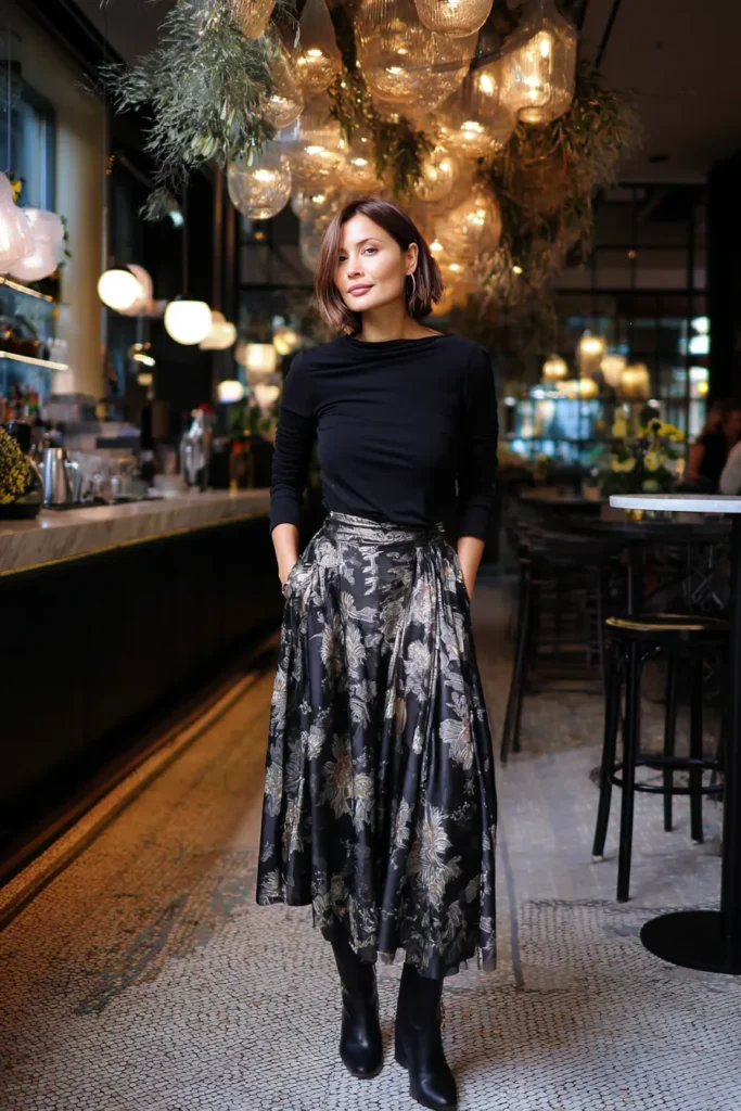 This outfit screams sophisticated evening glamour with a beautiful nod to vintage tapestry and luxurious fabrics. The lower half is a gorgeous, voluminous midi skirt with a high waist, featuring a dramatic black base with an ornate, silvery-gold floral or botanical print, likely in a rich jacquard or satin fabric. This dramatic volume is perfectly balanced by a sleek, fitted long-sleeve top in solid black, featuring a softly draped boat neck or cowl neck that is elegant and understated. She finishes the look with chic black leather heeled ankle boots and simple hoop earrings.
