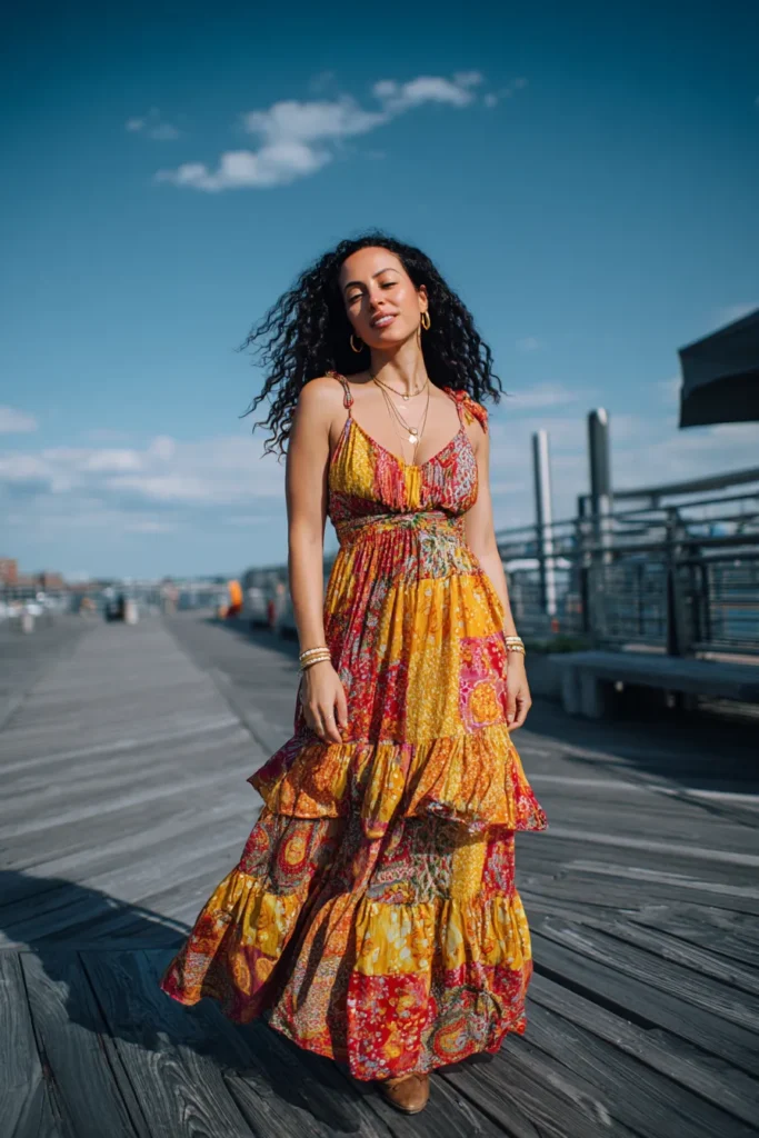 This dress is an absolute showstopper, capturing pure, vibrant bohemian dream energy under a bright blue sky. It is a stunning, flowing maxi dress made from lightweight fabric, featuring a patchwork construction of various patterns primarily in warm, saturated colors like sunny yellow, fiery red, and rich orange. The dress has delicate spaghetti straps that tie at the shoulder, a smocked or gathered bodice to define the waist, and dramatic tiered ruffles cascading down the skirt. Minimal accessories like layered gold necklaces and simple flat sandals keep the focus entirely on the incredible print and movement of the fabric.