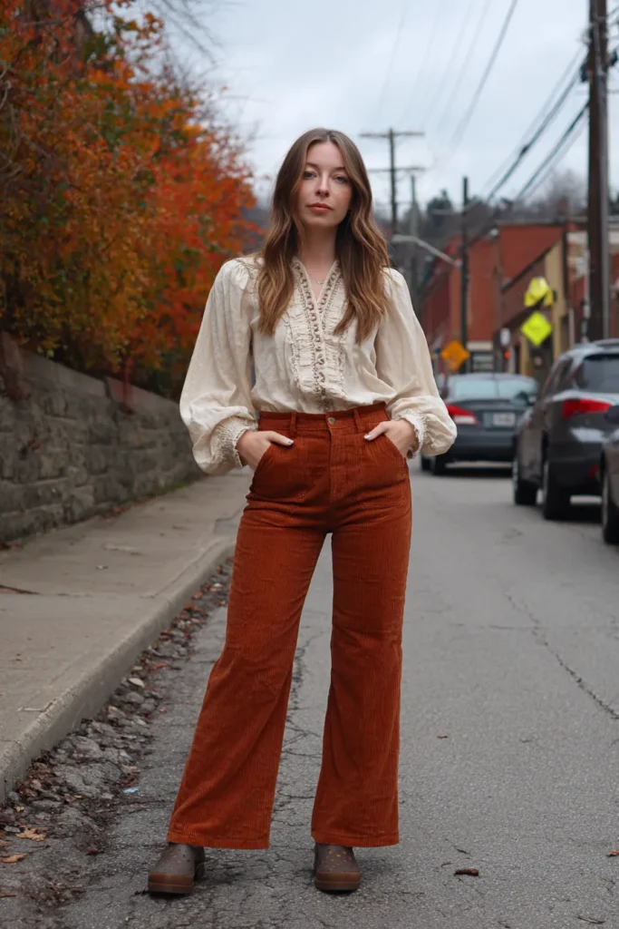 This look is a gorgeous embrace of rich autumn textures and romantic silhouettes, hitting that sweet spot between vintage and modern bohemian. She is wearing high-waisted, wide-leg trousers made of vibrant, textured corduroy in a deep, warm rust or burnt orange color. Tucked into these is an airy, light cream or ivory blouse featuring beautiful details like a ruffled placket running down the front and voluminous, slightly puffed sleeves gathered at the wrists. The whole outfit screams cozy fall vibes, ready for crisp air and colorful foliage.