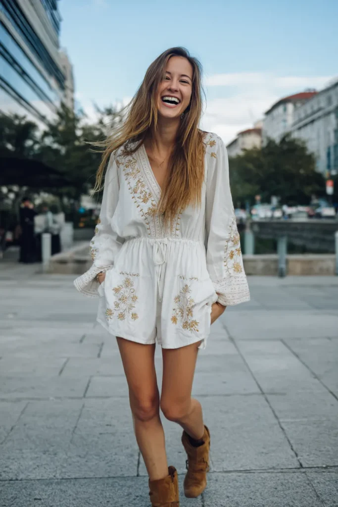 This outfit is the perfect blend of free-spirited comfort and festival-ready style, great for a casual daytime baby shower or a relaxed celebratory brunch. The focus is a crisp white romper or playsuit made from a light cotton or similar breathable fabric. It features a deep V-neck and stunning, intricate gold embroidery decorating the neckline, sleeves, and pockets of the shorts section. The waist is gathered and cinched with a simple drawstring tie. This breezy top half is contrasted beautifully with rustic, medium-brown suede ankle boots, giving the whole look a definite Western-boho flair.