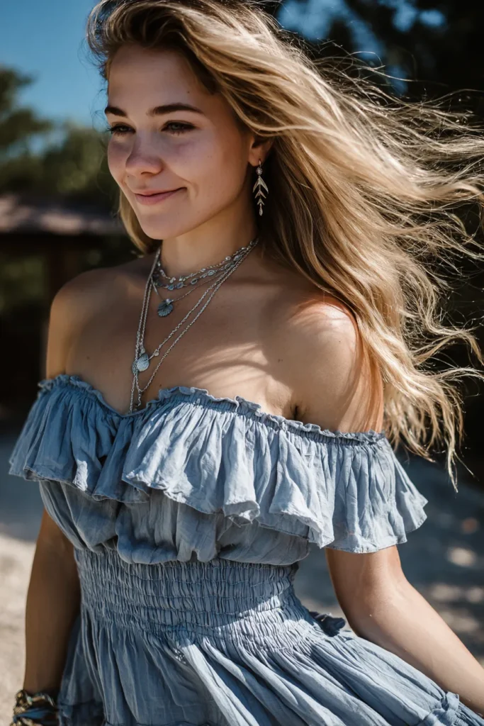 This is the dreamiest warm-weather look for a bright, airy baby shower, especially one near water or with a touch of seaside charm. The outfit is a gorgeous, dusty slate blue or pale sky-blue dress made from a lightweight, slightly crinkled fabric that moves beautifully. It features a very romantic, voluminous off-the-shoulder ruffle across the bust and short sleeves, while the bodice has detailed smocking to create a perfect, snug fit. Accessorizing with layered silver necklaces that feature sea-inspired charms and dangling leaf or feather earrings leans right into that natural, breezy boho aesthetic.