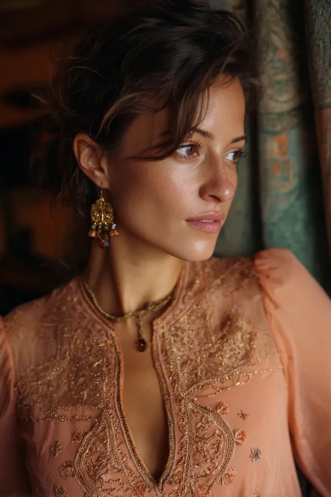 This outfit exudes a rich, globally inspired, slightly more formal bohemian elegance perfect for an indoor or evening baby shower celebration. The focus is a gorgeous tunic or kaftan top in a sheer, flowy fabric, likely chiffon or georgette, in a warm peach or soft apricot color. It boasts incredibly detailed gold beadwork and embroidery around the high neck and plunging keyhole neckline, featuring lovely paisley or stylized floral motifs. The long sleeves appear slightly puffed or gathered at the shoulder. This rich top is complemented by heavy, ornate gold statement earrings that dangle beautifully and delicate layered gold necklaces with amber or warm-toned pendants.