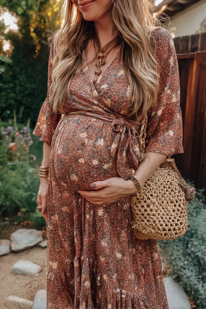 This stunning ensemble celebrates that warm, earthy bohemian spirit perfectly showcased by a comfortable wrap dress. The dress itself features a rich, rusty brown or terracotta base color adorned with a delicate, all-over floral print in muted yellows and soft reds which looks so perfect for golden hour lighting. The wrap style is beautifully adjustable which is a huge plus for a changing shape. Accessorizing is key here with multiple stacked gold bangles on her wrist and a fantastic chunky, multi-bead pendant necklace that draws the eye down. She carries a generously sized, loosely woven straw or macrame bag adding fantastic texture to the look.