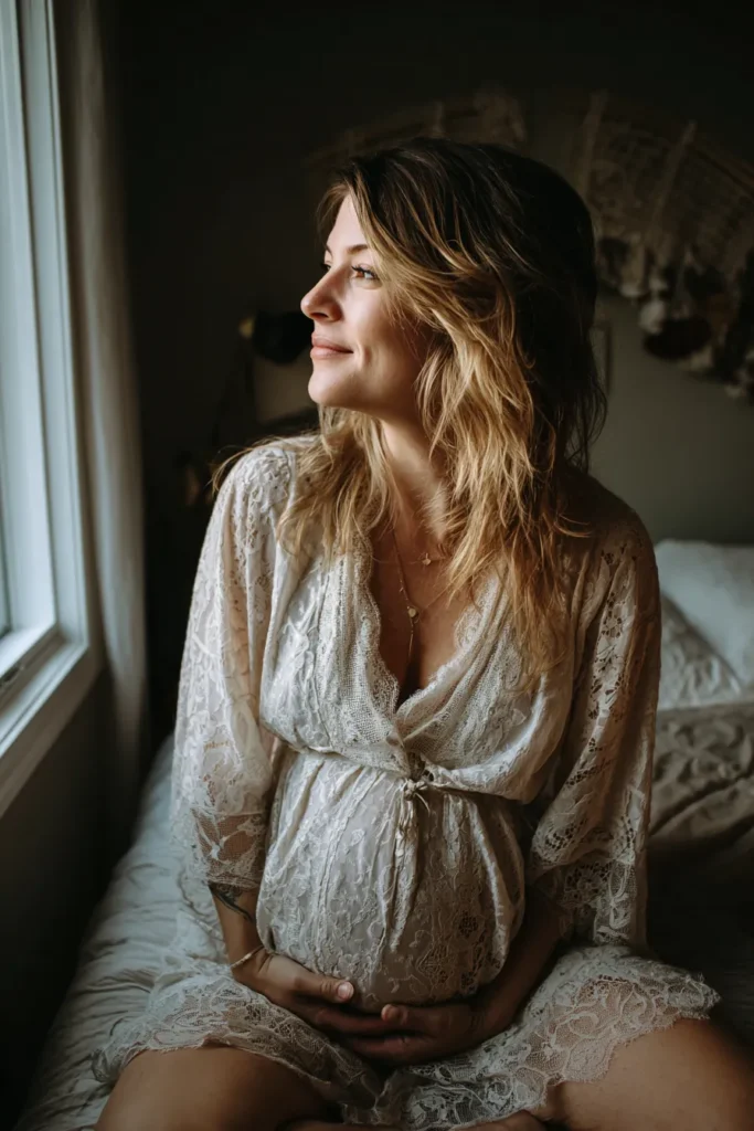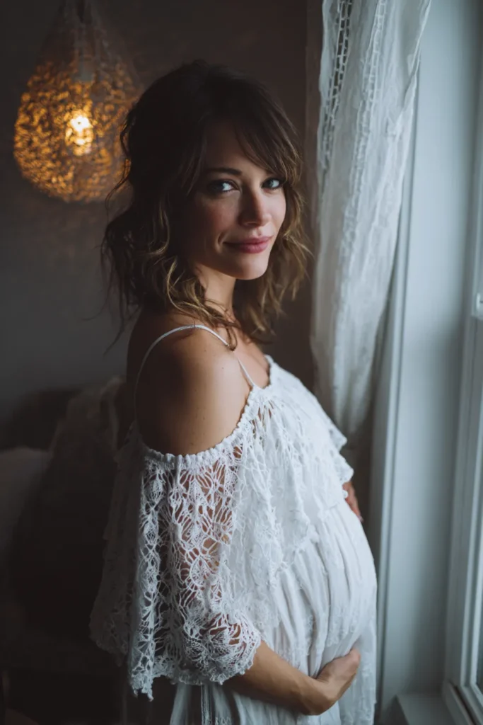 This look is all about pure, delicate romance captured in soft, luminous light, ideal for a peaceful moment at home or a dreamy photoshoot. She is wearing a beautiful, flowing robe or babydoll dress made entirely of intricate white or ivory lace fabric. The garment features wide, slightly sheer sleeves and a deep V-neckline that ties loosely at the empire waist, creating voluminous folds that gently drape over the baby bump. The overall vibe is incredibly soft, feminine, and timelessly bohemian with minimal jewelry letting the lace texture shine.