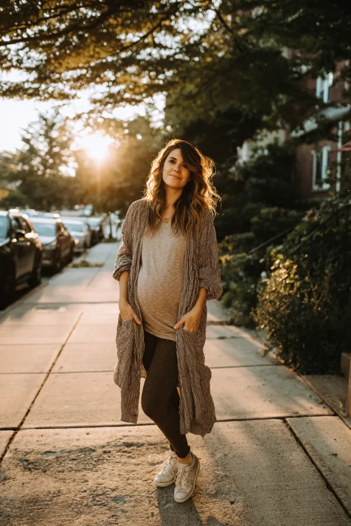 This look is all about cozy, earth-toned comfort with a touch of effortless layering perfect for a transitional season or a casual day out. She wears a soft, light tan or oatmeal-colored basic t-shirt that nicely accommodates the bump, paired with dark charcoal or deep olive maternity leggings for comfortable stretch. The defining piece is the long, open-front duster cardigan featuring a subtle vertical stripe pattern in coordinating neutral tones, giving incredible length and flow. Comfort is prioritized with classic, slightly worn white low-top sneakers and she carries a large, textured woven bag for all her necessities.