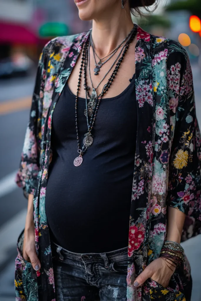 This look is a bold embrace of dark bohemian style perfect for a cooler evening stroll or a dressier travel transition. The core of the outfit pairs a simple black maternity tank top providing a sleek base with what appears to be dark, acid-washed or distressed denim bottoms. The absolute showstopper is the gorgeous, silky kimono worn open, featuring a rich black background covered in a dense, colorful floral print with pops of pink yellow and teal. She takes accessorizing to the next level with multiple layered necklaces in dark metal featuring intricate charms and pendants, plus an arm stack of beaded bracelets.