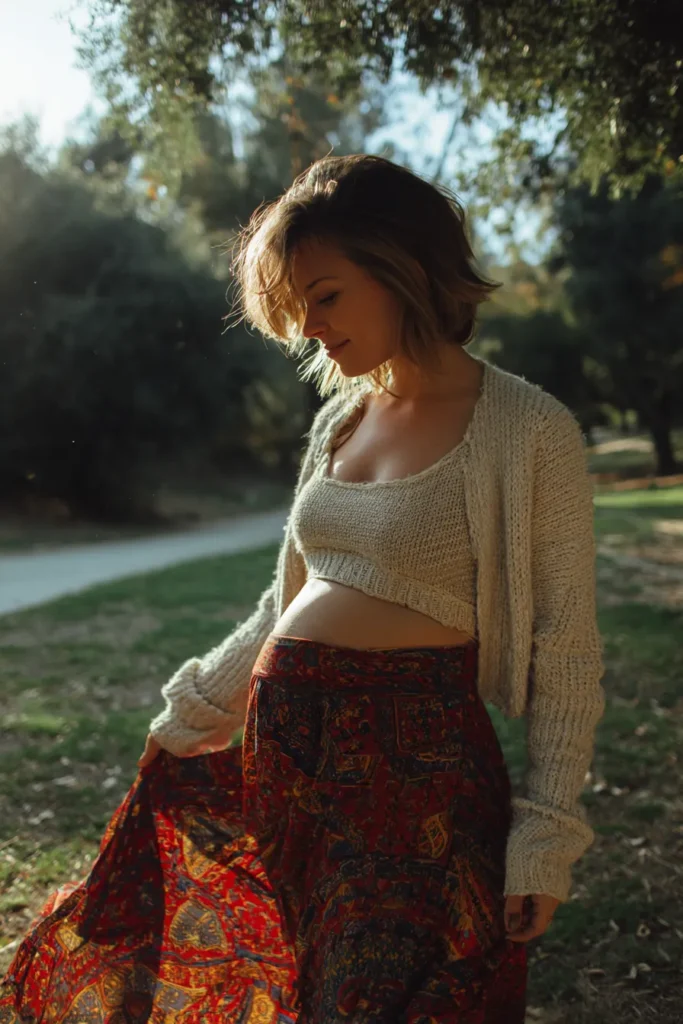 This look is a beautiful blend of cozy knitwear and vibrant bohemian pattern, perfect for a transitional season outing. She pairs a rich, dark floral or paisley print maxi skirt with a simple, light beige scoop-neck crop top that perfectly showcases her bump. Layered over this is an incredibly chunky, cozy knit cardigan in a neutral cream or oatmeal color with long sleeves that add wonderful texture and warmth. The overall vibe is earthy, warm, and very relaxed, beautifully suited for enjoying the golden light outdoors.
