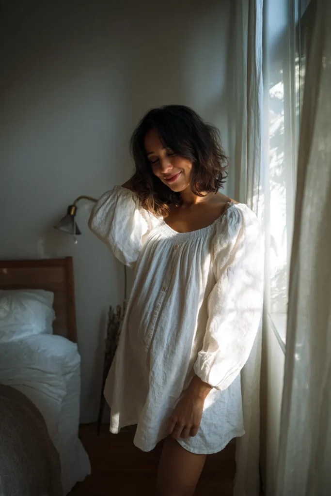 This look embodies an ultra-soft, romantic bohemian spirit perfect for relaxed moments indoors or a very casual getaway in warm weather. She is wearing a loose flowing top or short dress made from a crisp yet soft white linen or cotton fabric. The design features voluminous peasant-style sleeves that gather at the cuff and a wide, slightly off-the-shoulder neckline with a short button placket. The length hits mid-thigh offering a very relaxed and comfortable fit over her bump. The overall vibe is light, airy, and very serene, complemented by the soft indoor lighting.