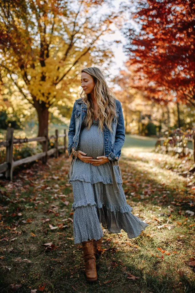I think this combination is just perfect for a cooler travel day because it balances comfort with so much visual interest. The empire waist of the dress allows my bump the space it needs while the tiered ruffles add lovely feminine movement as I walk through the autumn leaves. The denim jacket is the perfect textural contrast to the flowy dress, and I always find that pairing a dress with cute boots instantly makes the whole outfit feel more grounded and ready for adventure. This is my favorite way to keep things cozy and boho when the weather starts to turn.