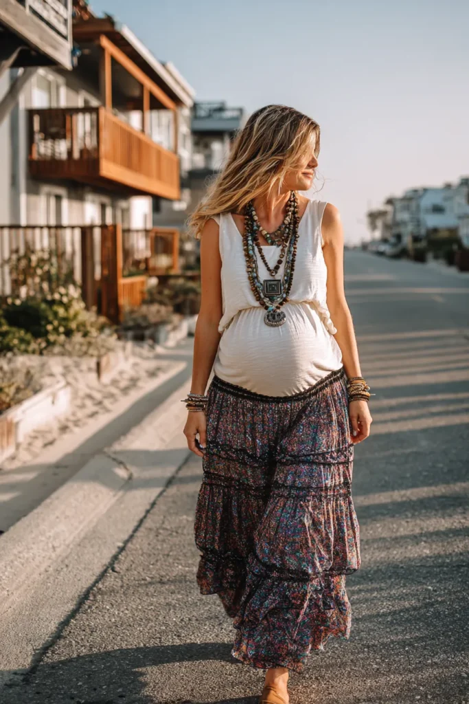 This look is all about maximalist bohemian layering creating a rich, textured statement perfect for a warm evening exploring a beach town. She pairs a simple, fitted white cami or tank top that highlights the bump with a gorgeous, voluminous tiered maxi skirt featuring a dense, small-scale floral or paisley print in deep, jewel-toned colors like blues purples and burgundy. The outfit is heavily accessorized with fabulous layers of long beaded necklaces in earthy tones with large statement pendants and stacks of rustic bangles on her wrists. The look is finished with simple flat sandals in a natural tan color.