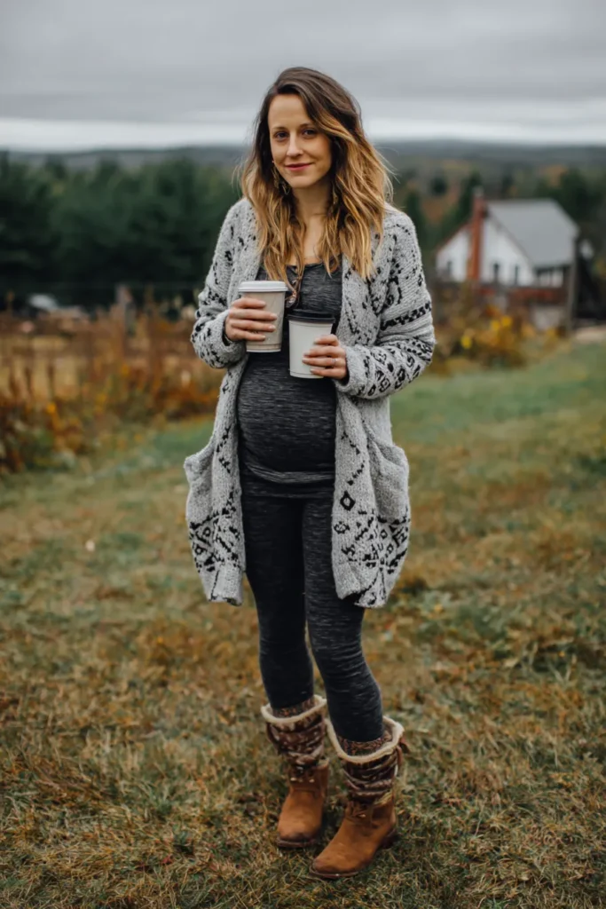 This look is pure cozy cabin chic, ideal for a crisp autumn travel day or a weekend retreat in the countryside. She is wearing dark grey heathered maternity leggings paired with a simple matching or dark grey tank top underneath. The absolute star is a wonderfully thick, chunky knit cardigan in a light grey or oatmeal color featuring a bold, black and white geometric or Fair Isle style pattern and huge cozy pockets. This is perfectly paired with rugged, mid-calf brown suede or leather boots lined with faux shearling or fur peeking out over thick grey socks.