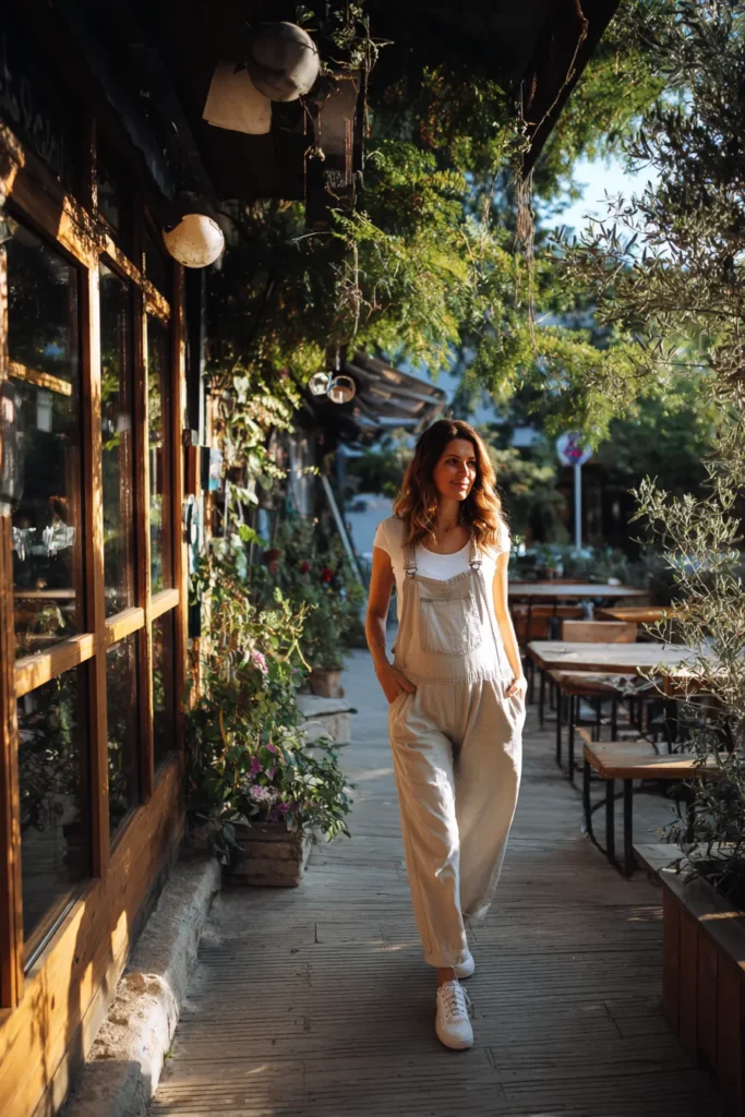 I think this combination is utterly genius for comfortable everyday wear during pregnancy because overalls are just so easy and accommodating. The linen fabric feels heavenly against the skin, and the relaxed fit of the legs means I can move around freely without feeling restricted. Pairing the light-colored overalls with a simple white tee keeps the focus clean and bright, while the white sneakers give it a slightly modern, fresh update. If you want an outfit that is practical for travel but still looks effortlessly cool and aligns with that natural boho aesthetic, you need to try this classic combo.