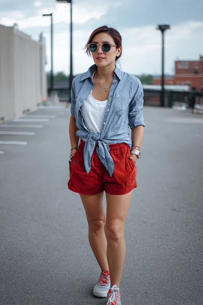 This look is the definition of fun, casual summer style with a fantastic patriotic color pop perfect for the 4th of July weekend. It features bright, textured red corduroy shorts with a comfortable drawstring waist, paired with a simple white tank top underneath an unbuttoned, light-wash chambray or denim button-down shirt that is tied casually at the waist. The look is finished with sporty white sneakers that have some hints of red lacing, and classic aviator sunglasses.