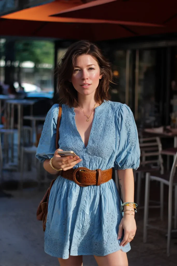 This look is the definition of breezy summer romance with a lovely boho twist, perfect for a sunny afternoon walk. The focus is a light blue mini-dress, likely made of cotton eyelet or embroidered fabric, featuring a flattering deep V-neck and cute puff sleeves. This soft silhouette is cinched dramatically at the natural waist with a wide, richly textured brown leather belt that has a large, ornate buckle. Accessories include delicate gold layered necklaces and a mix of thin, colorful bracelets.