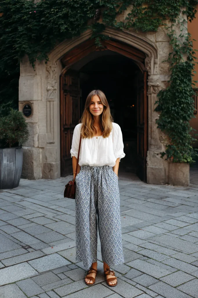I find this combination so incredibly chic for hot weather because every piece feels light and airy. The peasant blouse is such a romantic staple, giving beautiful volume around the shoulders, and tucking it just slightly into the high waist keeps the proportions balanced. Those wide-leg printed pants are amazing because they look so much more polished than shorts but feel just as breezy, plus the cropped length lets those cute leather sandals shine. It’s the perfect outfit for sightseeing or enjoying an outdoor cafe without sacrificing comfort or style.