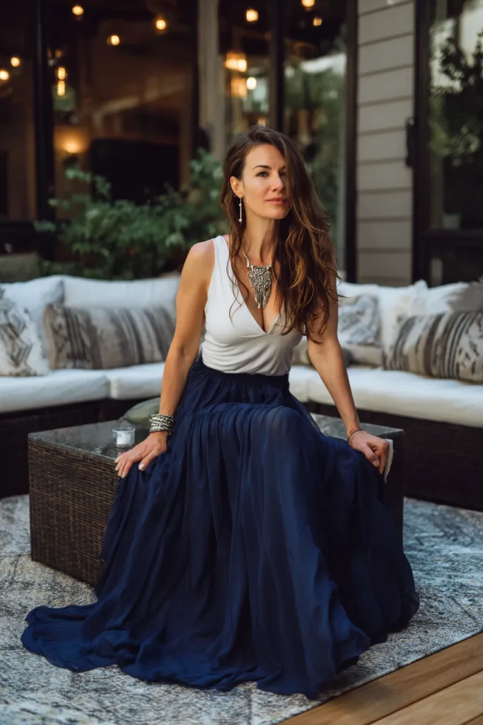 This look is pure elevated bohemian elegance perfect for a chic summer evening gathering. It consists of a deep navy blue maxi dress made from a light, flowing fabric like chiffon or gauze, featuring a very deep, plunging halter neckline and tiered layers that create gorgeous movement. The bohemian influence shines through in the heavy, elaborate silver statement necklace and stacked bracelets, contrasting beautifully with the simple white tank top worn underneath. The ensemble is finished with simple brown flat sandals.