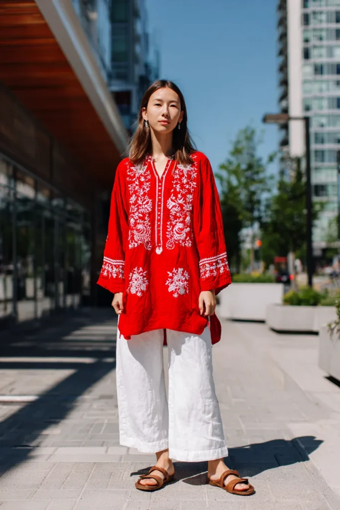 I absolutely adore this outfit because it marries that stunning, rich craftsmanship of the embroidered tunic with the airy comfort needed for warm weather. The bright red and white combination naturally brings a patriotic cheer perfect for any summer celebration, while the loose, flowy pants keep the whole vibe relaxed and very bohemian. I find this pairing so flattering because the volume in the top is perfectly balanced by the wide but cropped pant leg, making the whole silhouette feel effortlessly chic and breezy. It’s a fantastic way to look bright and put-together without wearing anything tight.