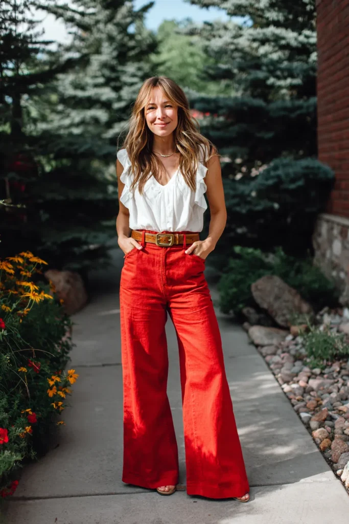 This outfit is a vibrant celebration of color and flow, giving off major 70s inspired, relaxed summer vibes perfect for a holiday gathering. The look centers around statement high-waisted, wide-leg pants in a bold, saturated red fabric that looks light and breezy. These are perfectly complemented by a crisp white top featuring delicate ruffles on the shoulder straps and a flattering V-neckline. A wide, embossed brown leather belt cinches the waist, adding a beautiful rustic, boho touch.