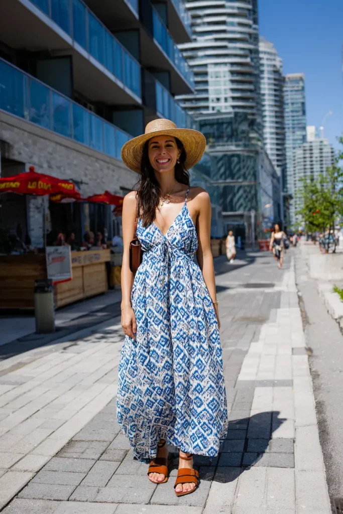 This look is absolute summer perfection, channeling a beautiful vacation-ready bohemian spirit ideal for a sunny day exploring a vibrant city. The key piece is a stunning blue and white maxi dress featuring a gorgeous, busy ikat or tribal print throughout the flowing fabric. It has delicate spaghetti straps and a tie-front detail at the bust, with an easy, breezy silhouette that falls to the ankle. The look is accessorized perfectly with a wide-brim straw sun hat, simple brown buckled sandals, and a small leather crossbody bag.
